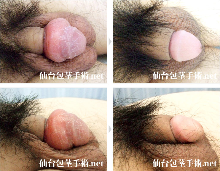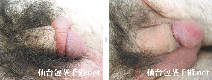 絞扼の強いカントン包茎の症例です。元々、剥けづらかったために、剥いた事がなかったものの、風俗に行って強引にむかれ、戻らなくなってしまったようです。医学的知識もなく、どうして良いか分からなかったために、2週間様子を見ていたものの、改善する様子は無く、むしろ痛みが増強し我慢できなくなり、包茎手術を決意されました。包皮の絞扼が強く余剰の包皮は腫れていました。絞扼輪を除去し、腫れあがった包皮は切除しました。普通の状態になり安心していただけました。カントン包茎の状態になった場合、自己整復を試みられる方がいらっしゃいますが、このようになると自己修正は、まず無理です。包茎治療が必要になるケースも多く、素人判断は危険です。早めに専門医を受診することをお勧めしています。